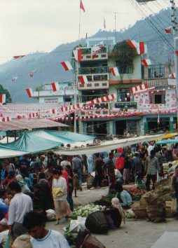 <いろいろな山の民が集うバザール。赤白旗はSSPの政党旗>