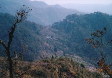 <シムラーからウッタル・プラデーシュ丘陵、タライ平原への道。段々畑が山肌を埋める典型的な中間丘陵の風景>
